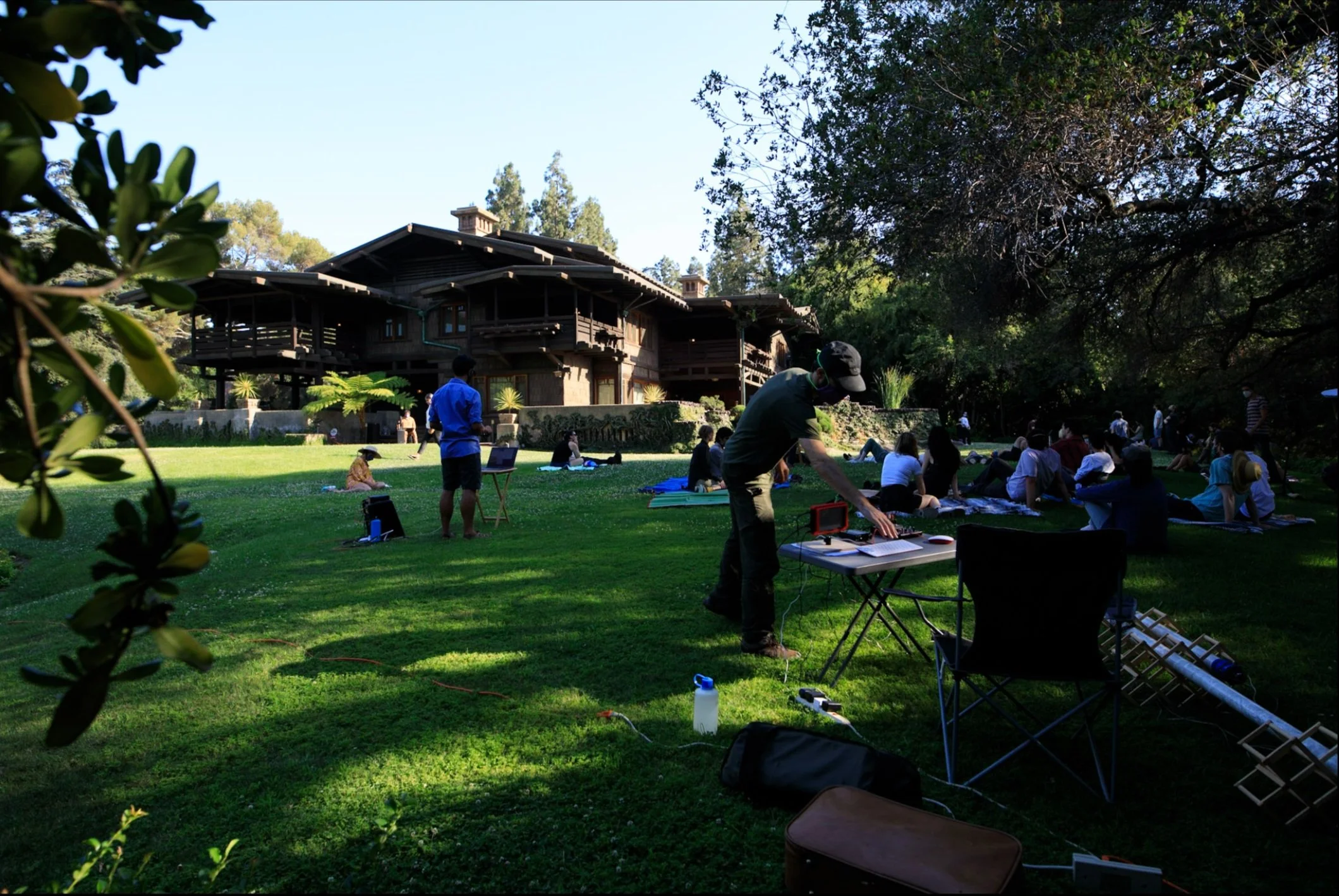 The performance was created during the height of the Covid 19 pandemic and the festival was looking for ways to safely gather together and create a collective listening and performance event. The event was hosted on the grounds of the historic Gamble House–an historic Craftsman home in Pasadena, California.